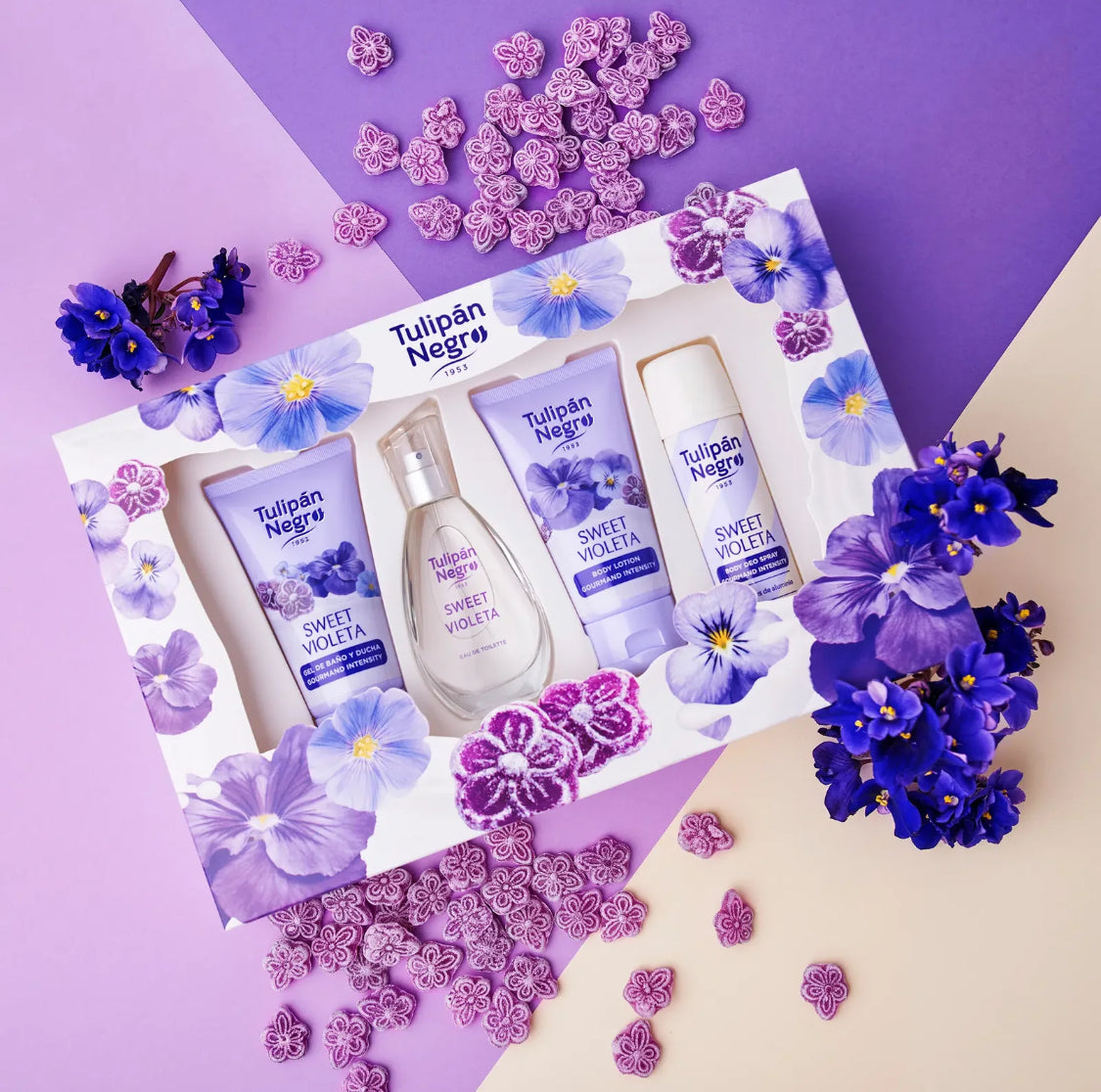 Confezione regalo Sweet Violeta contenente 1 eau de toilette, 1 crema corpo, 1 bagnoschiuma e 1 deodorante spray.